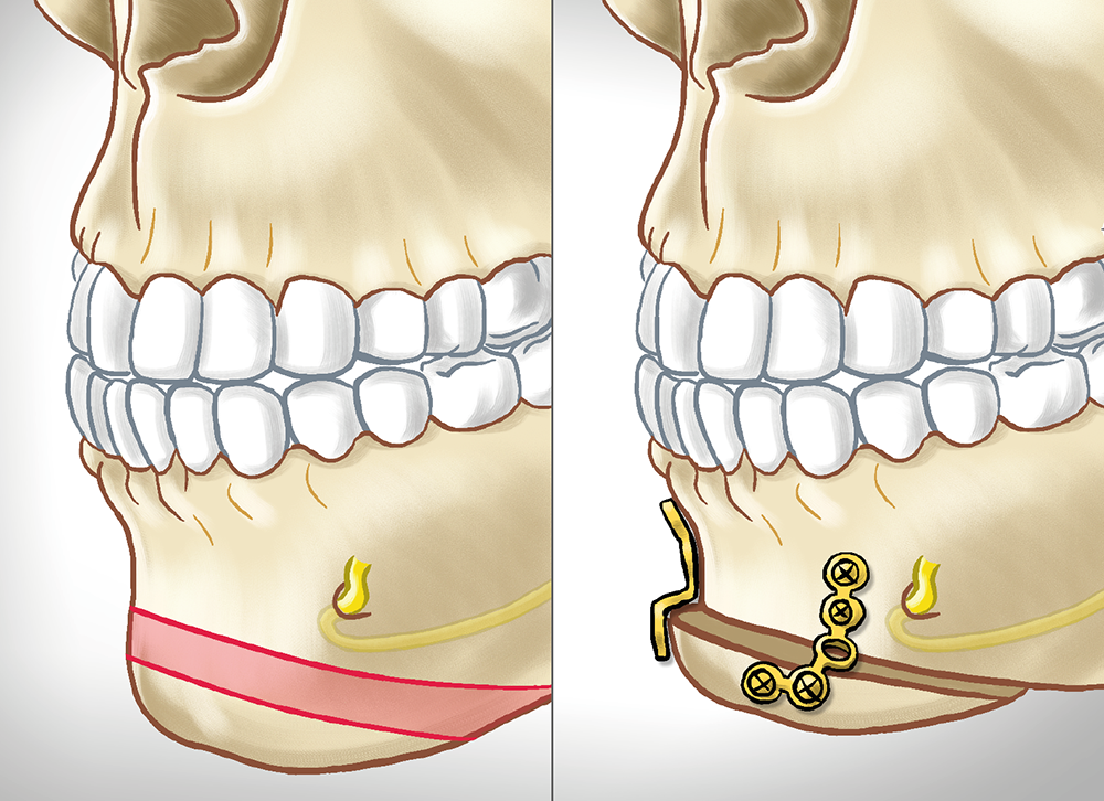 A cirurgia é realizada em ambiente hospitalar sob anestesia geral tendo uma duração média de 1h e o paciente ficará aproximadamente 24 horas internado no hospital. O mento é reposicionado para garantir a correta relação com as demais estruturas da face e fixado com miniplacas e miniparafusos de titânio.